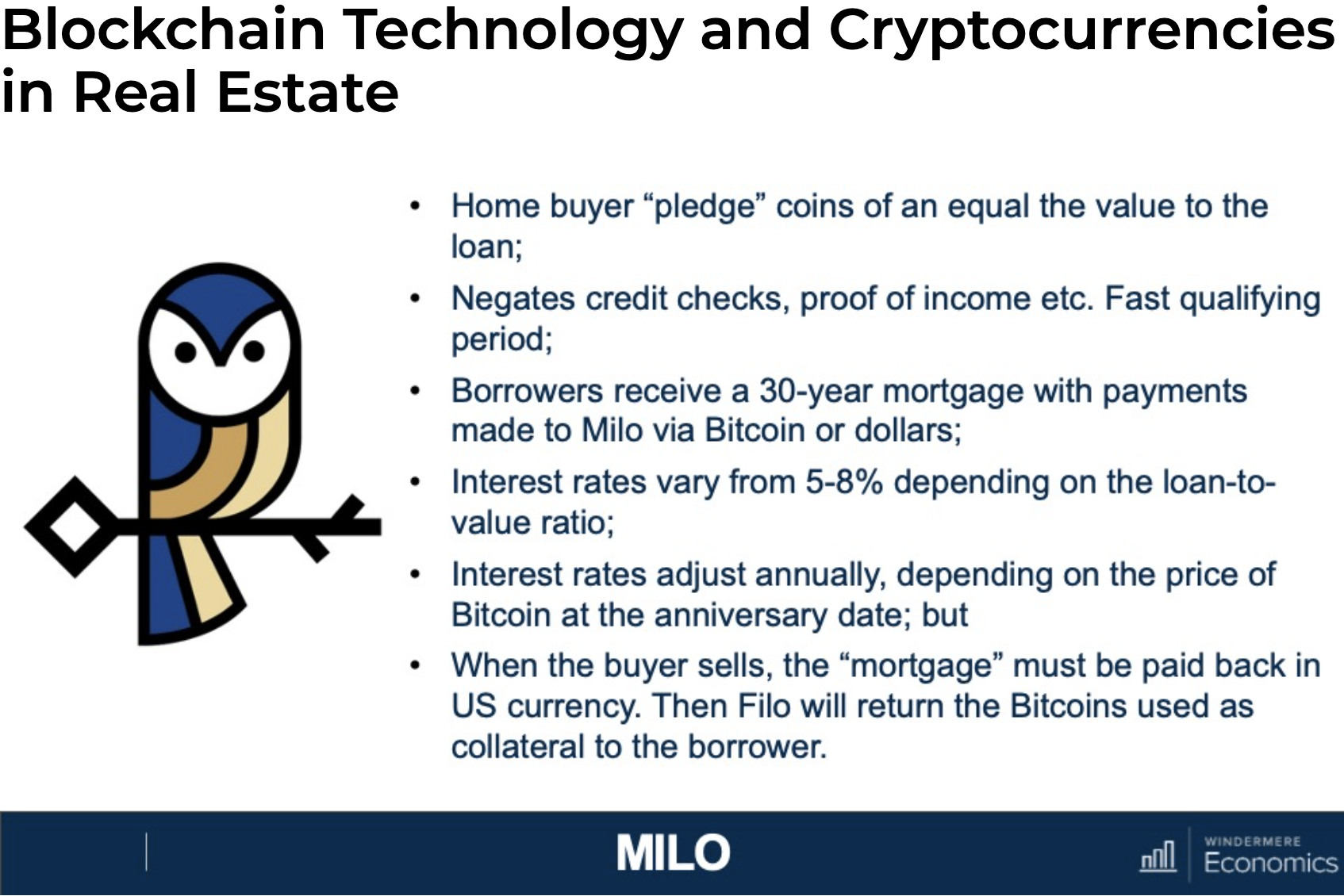 I think that this is certainly an interesting play in the ownership housing sector and, although still in its infancy, looks to meet the needs of crypto owners who don’t want to face the tax obligation that would occur if they were to sell their coins to buy a home. Now, I must make clear that Windermere is certainly not endorsing Milo. In fact, I personally have concerns about the program given how volatile cryptocurrencies are.
